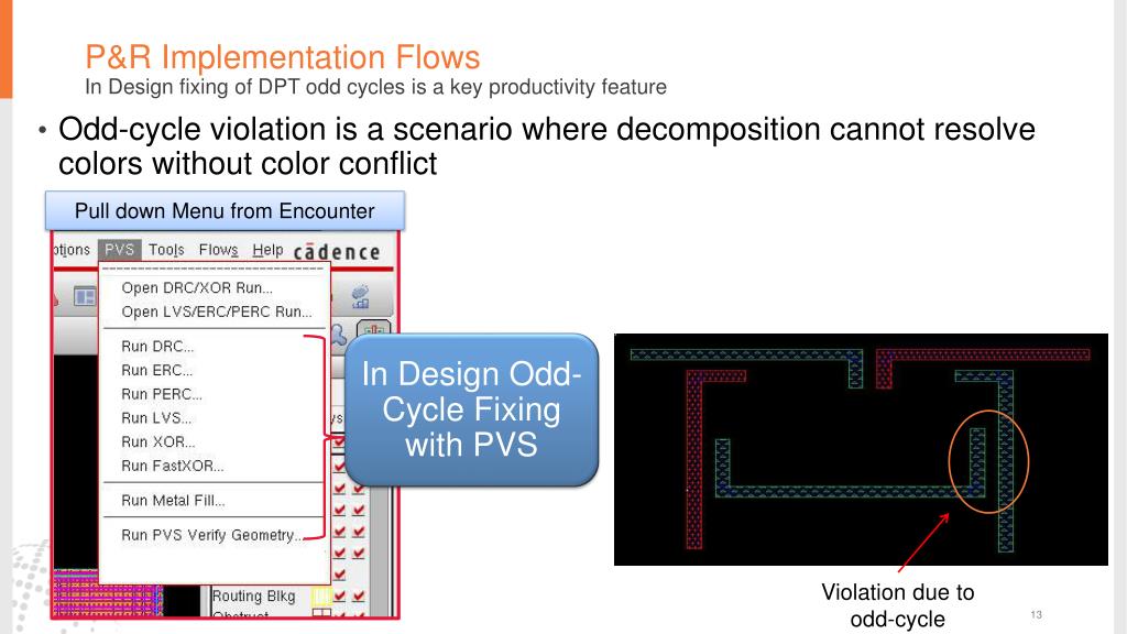 P&R Implementation FlowsIn Design fixing of DPT odd cycles is a key productivity feature • Odd-cycle violation is a scenario where decomposition cannot resolve colors without color conflict Pull down Menu from Encounter In Design Odd-Cycle Fixing with PVS Violation due to odd-cycle
