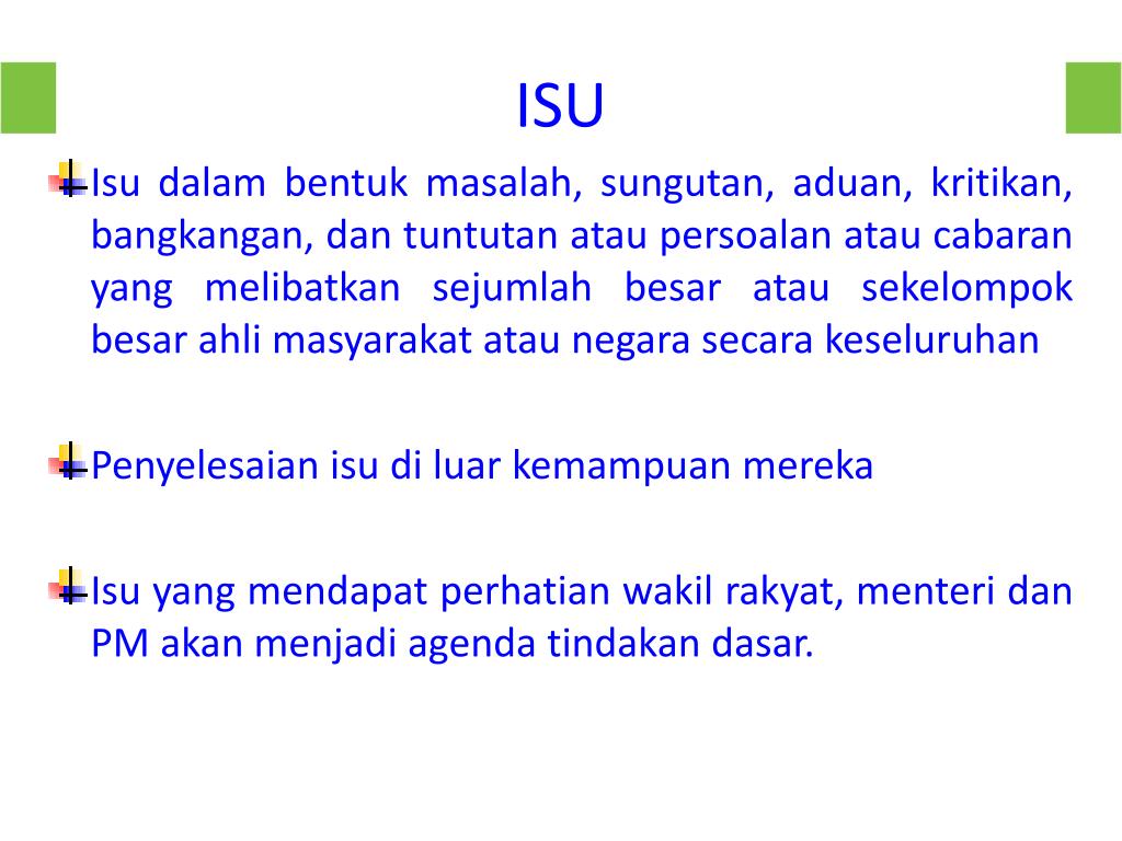 ISU • Isu dalam bentuk masalah, sungutan, aduan, kritikan, bangkangan, dan tuntutan atau persoalan atau cabaran yang melibatkan sejumlah besar atau sekelompok besar ahli masyarakat atau negara secara keseluruhan • Penyelesaian isu di luar kemampuan mereka • Isu yang mendapat perhatian wakil rakyat, menteri dan PM akan menjadi agenda tindakan dasar.