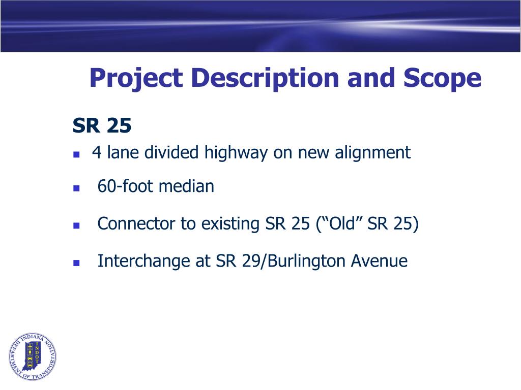 Project Description and Scope Bridges • SR 25 over Old 25 and Norfolk Southern Railroad • SR 25 over Unnamed Creek • SR 25 over SR 29 • SR 25 over Burlington Ave. • SR 25 over Kokomo Pike
