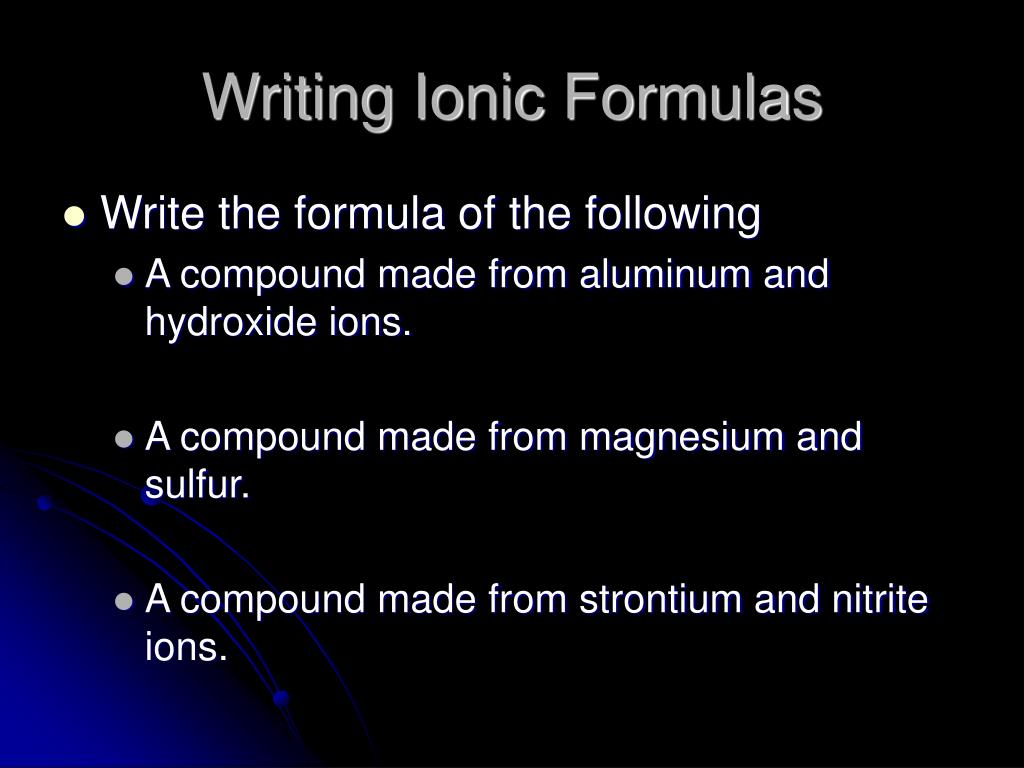 Writing Ionic Formulas • Write the formula of the following • A compound made from aluminum and hydroxide ions. • A compound made from magnesium and sulfur. • A compound made from strontium and nitrite ions.