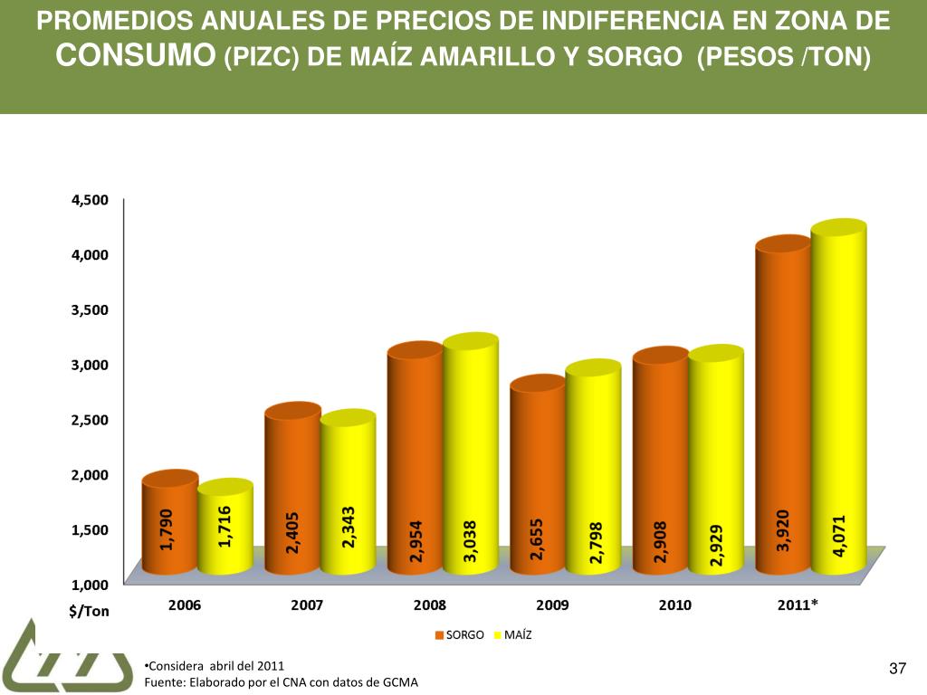 PRECIOS DE INDIFERENCIA EN ZONA DE CONSUMO (PIZC) DE MAÍZ AMARILLO Y SORGO (PESOS/TON) AGOSTO 2005 – 11 ABRIL 2011 2006 2007 2010 2008 2009 2005 36 Fuente: Elaborado por el CNA con datos de GCMA Precio promedio actualizado al 11 de abril de 2011, considera las entidades federativas D.F., Guadalajara, Puebla, Monterrey, Culiacán y Mérida