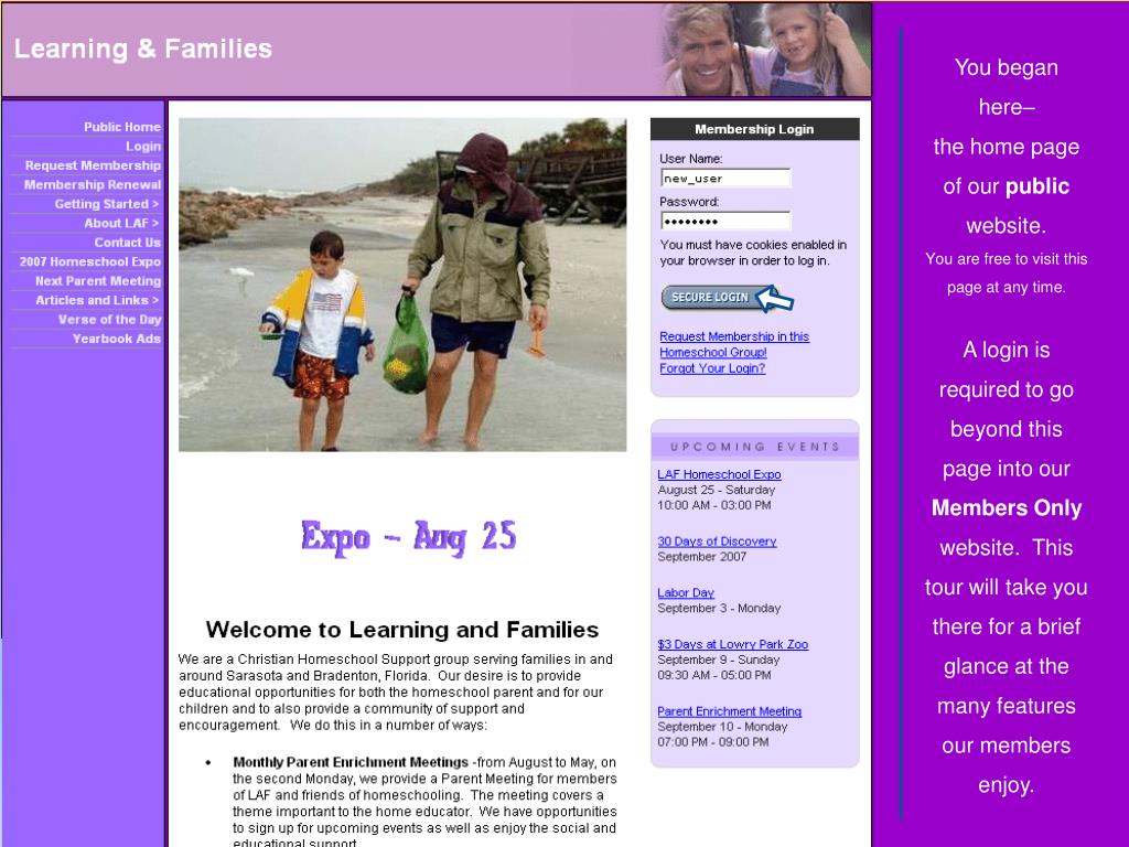 Website Tour. You began here– the home page of our public website. You are free to visit this page at any time . A login is required to go beyond this page into our Members Only website. This tour will take you there for a brief glance at the many features our members enjoy.