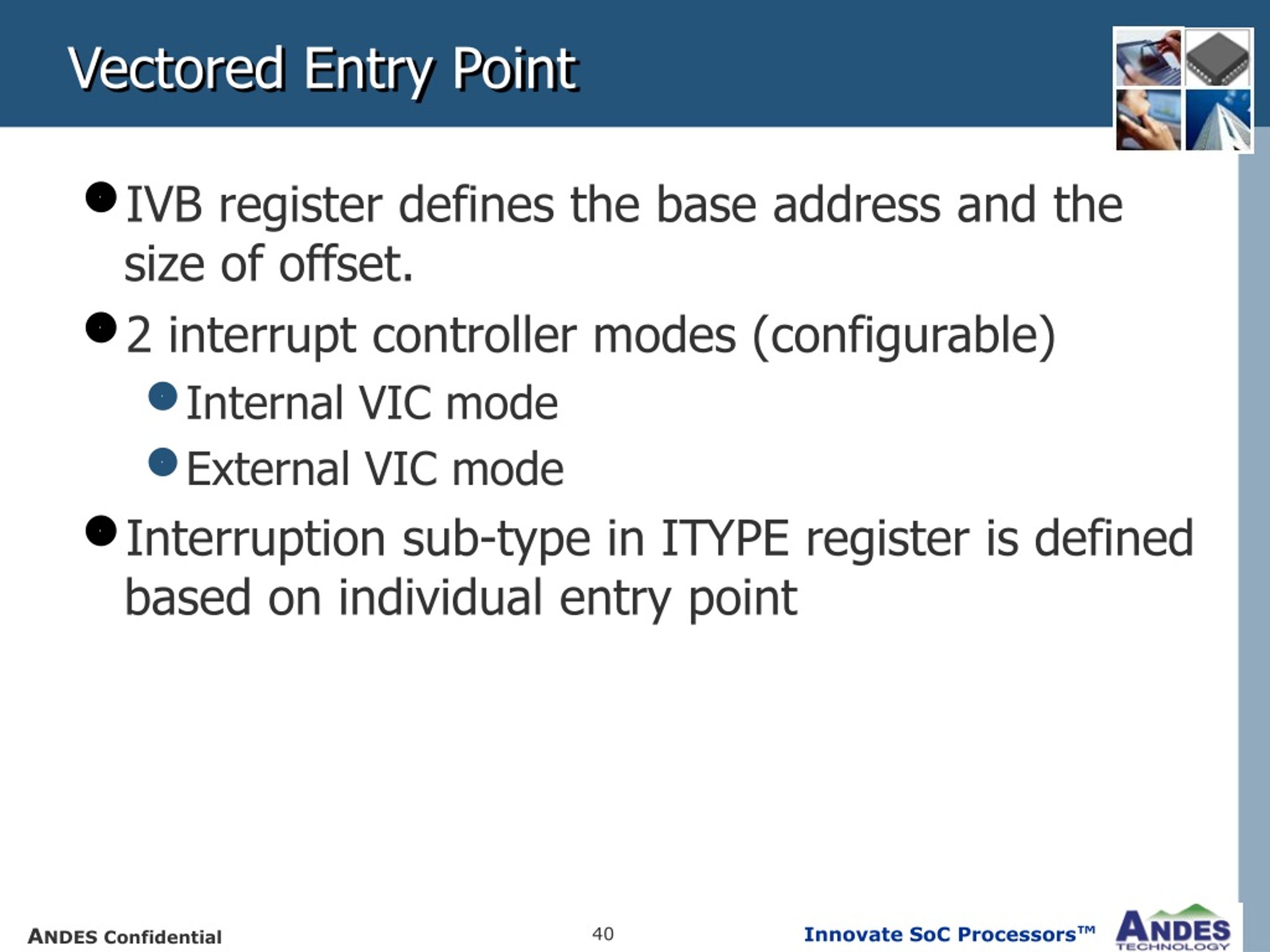 IVB register defines the base address and the size of offset. 2 interrupt controller modes (configurable) Internal VIC mode External VIC mode Interruption sub-type in ITYPE register is defined based on individual entry point Vectored Entry Point