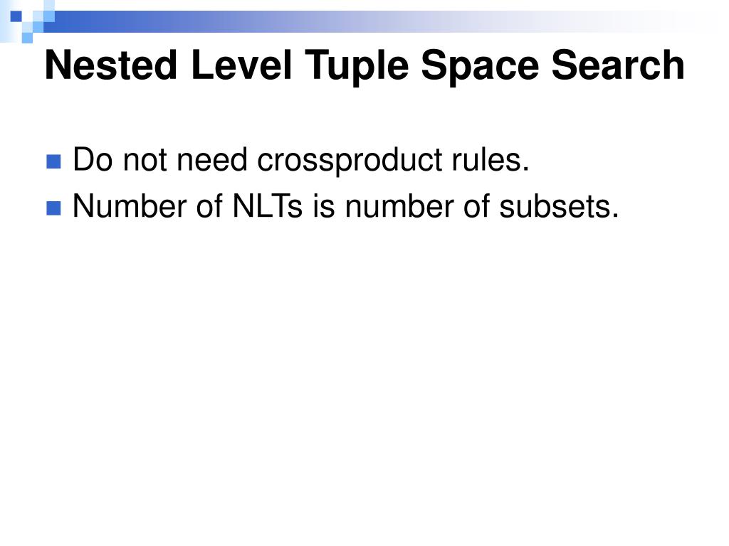 Nested Level Tuple Space Search • Do not need crossproduct rules. • Number of NLTs is number of subsets.