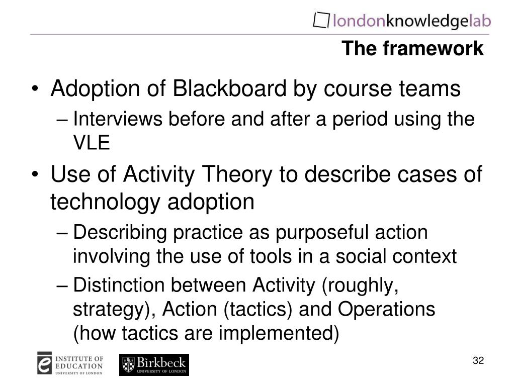 The framework • Adoption of Blackboard by course teams • Interviews before and after a period using the VLE • Use of Activity Theory to describe cases of technology adoption • Describing practice as purposeful action involving the use of tools in a social context • Distinction between Activity (roughly, strategy), Action (tactics) and Operations (how tactics are implemented)
