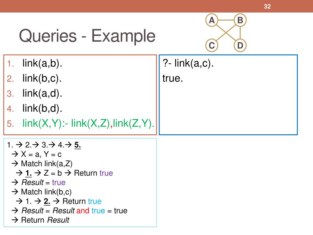 A B C D Queries - Example • link(a,b). • link(b,c). • link(a,d). • link(b,d). • link(X,Y):- link(X,Z),link(Z,Y). ?- link(a,c). true. 1. 2. 3. 4. 5. X = a, Y = c Match link(a,Z) 1. Z = b Return true Result = true Match link(b,c) 1. 2. Return true Result = Result andtrue = true Return Result