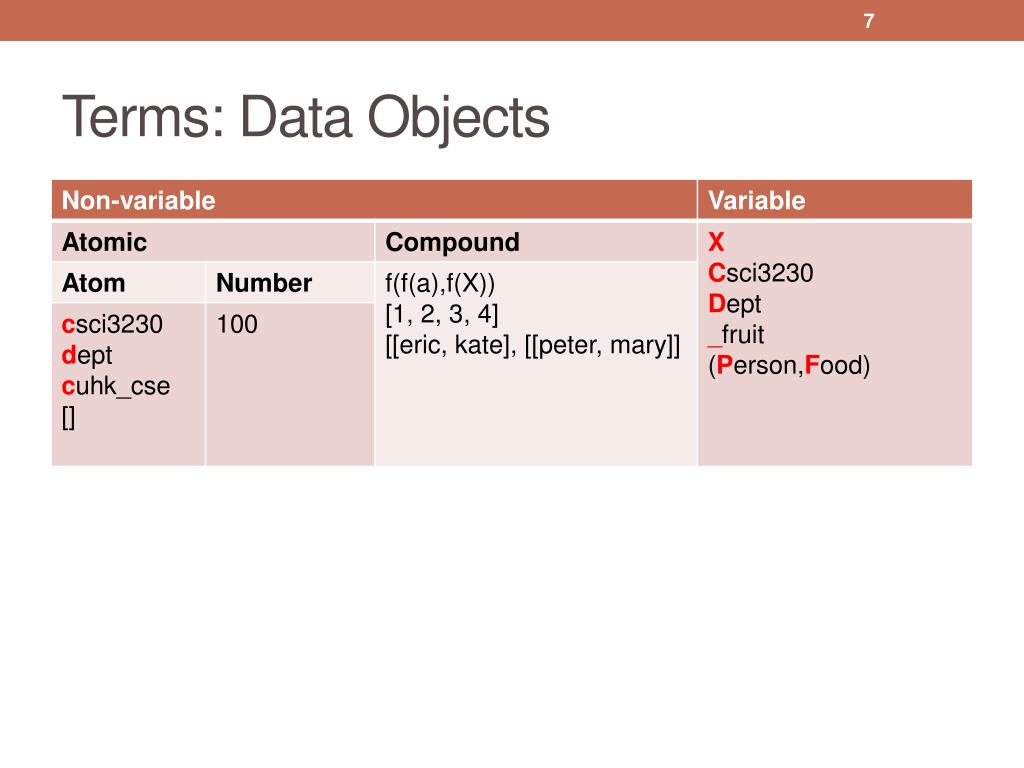 Compound Term (a.k.a. Structure) f(t1,t2,…,tn) • f : functor • Ti : terms • Arity : number of sub-terms Example 1 likes(fruit(lemon,who(tom,alex))).%Fact likes(fruit(apple,who(ben,fred))).%Fact ?- likes(fruit(apple,who(ben,fred))). true.