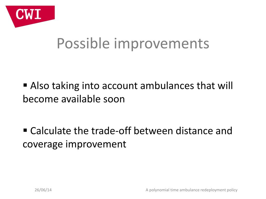 Possible improvements Also taking into account ambulances that will become available soon Calculate the trade-off between distance and coverage improvement A polynomial time ambulance redeployment policy