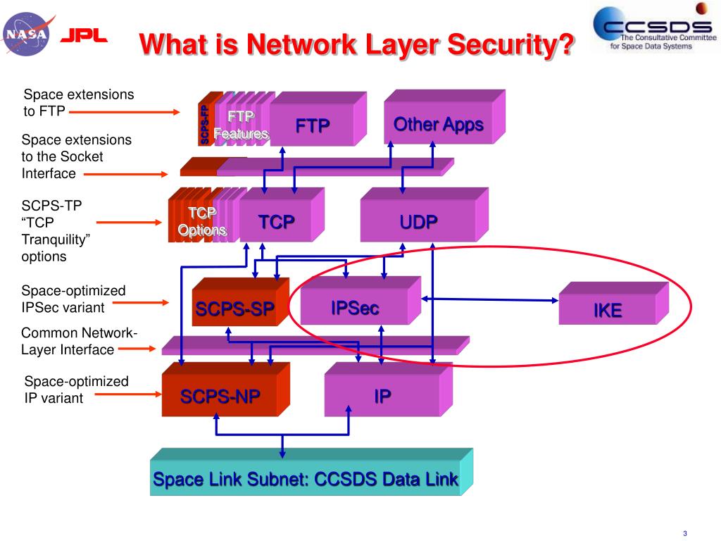 What is Network Layer Security? Space extensions to FTP Other Apps SCPS-FP FTP Features FTP Space extensions to the Socket Interface SCPS-TP “TCP Tranquility” options TCP Options TCP UDP Space-optimized IPSec variant IPSec SCPS-SP IKE Common Network- Layer Interface Space-optimized IP variant IP SCPS-NP Space Link Subnet: CCSDS Data Link