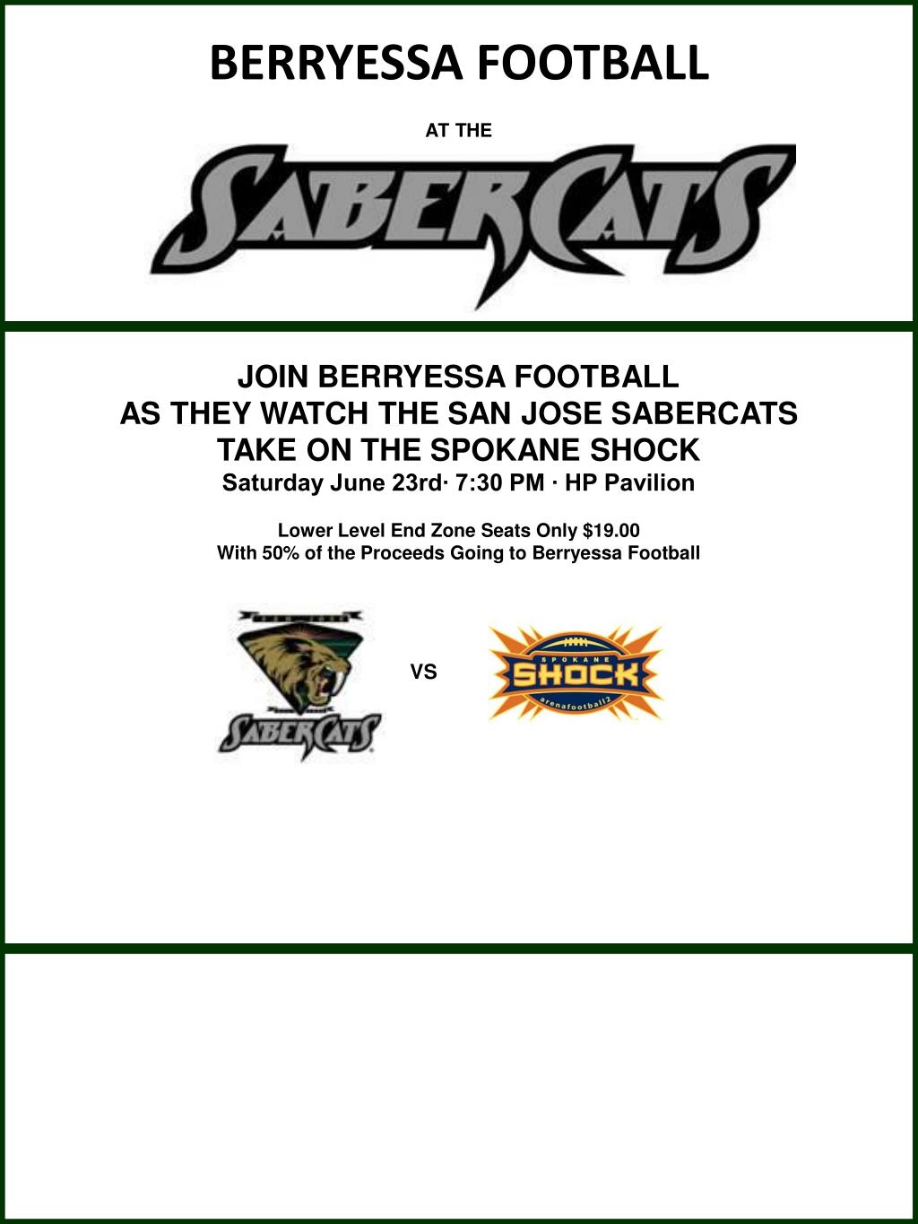 BERRYESSA FOOTBALL AT THE Join BERRYESSA FOOTBALL as they watch the san josesabercats take on the SPOKANE SHOCK • Saturday June 23rd∙ 7:30 PM ∙ HP Pavilion Lower Level End Zone Seats Only $19.00 With 50% of the Proceeds Going to Berryessa Football VS