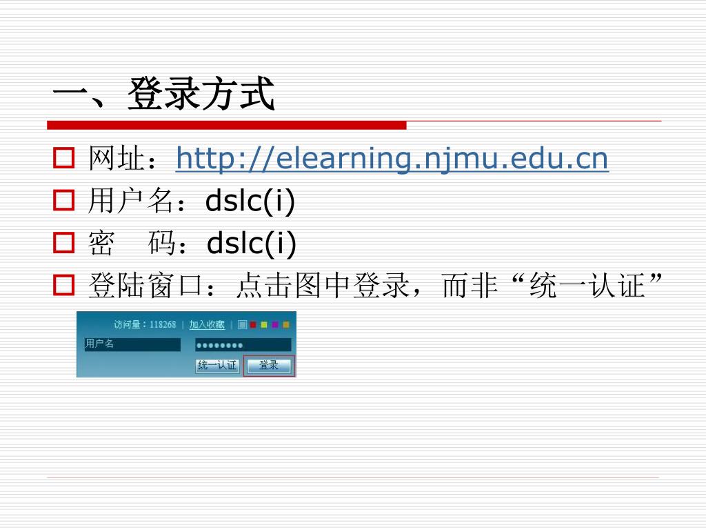 E-learning 课程平台互动介绍. 教务处 刘金波 2013 年 12 月 6 日. 一、登录方式. 网址: http://elearning.njmu.edu.cn 用户名: dslc(i) 密 码: dslc(i) 登陆窗口:点击图中登录,而非 “ 统一认证 ”. 二、基本内容建设. 登陆成功后,点击 “ 我的空间 ”. 三、互动栏目建设. 互动的内容 作业 答疑 论坛 网络考试. 三、互动栏目建设. 步骤 1 开权限 2 加学生 3 导题库 4 出试卷(考试 论坛 答疑 作业). 谢 谢.