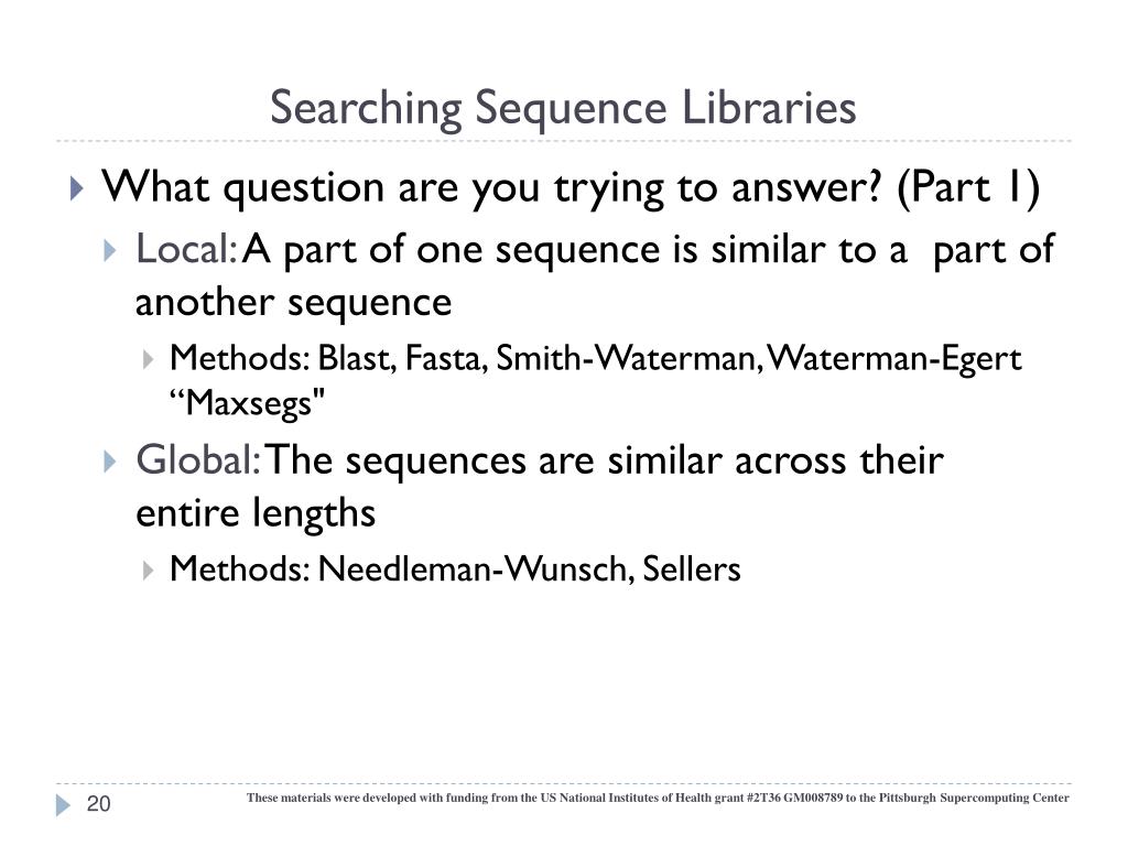 Searching Sequence Libraries • What question are you trying to answer? (Part 1) • Local: A part of one sequence is similar to a part of another sequence • Methods: Blast, Fasta, Smith-Waterman, Waterman-Egert “Maxsegs" • Global: The sequences are similar across their entire lengths • Methods: Needleman-Wunsch, Sellers These materials were developed with funding from the US National Institutes of Health grant #2T36 GM008789 to the Pittsburgh Supercomputing Center