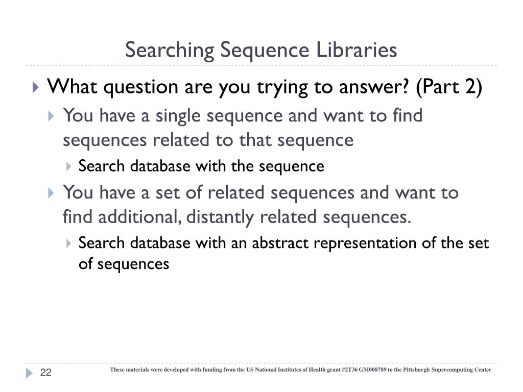 Searching Sequence Libraries • What question are you trying to answer? (Part 2) • You have a single sequence and want to find sequences related to that sequence • Search database with the sequence • You have a set of related sequences and want to find additional, distantly related sequences. • Search database with an abstract representation of the set of sequences These materials were developed with funding from the US National Institutes of Health grant #2T36 GM008789 to the Pittsburgh Supercomputing Center