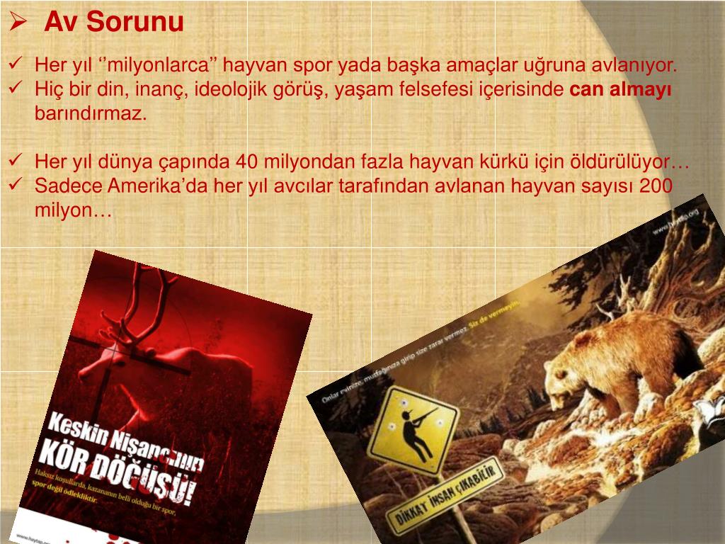 Av Sorunu • Her yıl ‘’milyonlarca’’ hayvan spor yada başka amaçlar uğruna avlanıyor. • Hiç bir din, inanç, ideolojik görüş, yaşam felsefesi içerisinde can almayı barındırmaz. • Her yıl dünya çapında 40 milyondan fazla hayvan kürkü için öldürülüyor… • Sadece Amerika’da her yıl avcılar tarafından avlanan hayvan sayısı 200 milyon…