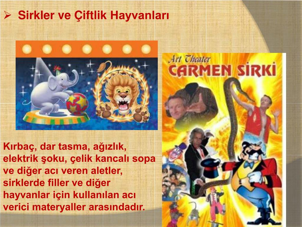 Sirkler ve Çiftlik Hayvanları Kırbaç, dar tasma, ağızlık, elektrik şoku, çelik kancalı sopa ve diğer acı veren aletler, sirklerde filler ve diğer hayvanlar için kullanılan acı verici materyaller arasındadır.