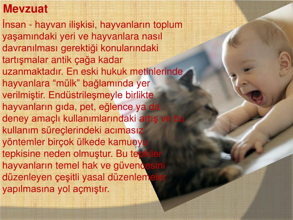 Mevzuat İnsan - hayvanilişkisi, hayvanlarıntoplumyaşamındakiyerivehayvanlaranasıldavranılmasıgerektiğikonularındakitartışmalarantikçağakadaruzanmaktadır. En eskihukukmetinlerindehayvanlara “mülk” bağlamındayerverilmiştir. Endüstrileşmeylebirliktehayvanlarıngıda, pet, eğlenceya da deneyamaçlıkullanımlarındakiartışvebukullanımsüreçlerindekiacımasızyöntemlerbirçokülkedekamuoyutepkisinenedenolmuştur. Bu tepkilerhayvanlarıntemelhakvegüvencesinidüzenleyençeşitliyasaldüzenlemeleryapılmasınayolaçmıştır.