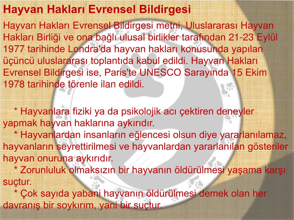 Hayvan Hakları Evrensel Bildirgesi Hayvan Hakları Evrensel Bildirgesi metni, Uluslararası Hayvan Hakları Birliği ve ona bağlı ulusal birlikler tarafından 21-23 Eylül 1977 tarihinde Londra'da hayvan hakları konusunda yapılan üçüncü uluslararası toplantıda kabul edildi. Hayvan Hakları Evrensel Bildirgesi ise, Paris'te UNESCO Sarayında 15 Ekim 1978 tarihinde törenle ilan edildi. * Hayvanlara fiziki ya da psikolojik acı çektiren deneyler yapmak hayvan haklarına aykırıdır. * Hayvanlardan insanların eğlencesi olsun diye yararlanılamaz, hayvanların seyrettirilmesi ve hayvanlardan yararlanılan gösteriler hayvan onuruna aykırıdır. * Zorunluluk olmaksızın bir hayvanın öldürülmesi yaşama karşı suçtur. * Çok sayıda yabani hayvanın öldürülmesi demek olan her davranış bir soykırım, yani bir suçtur.