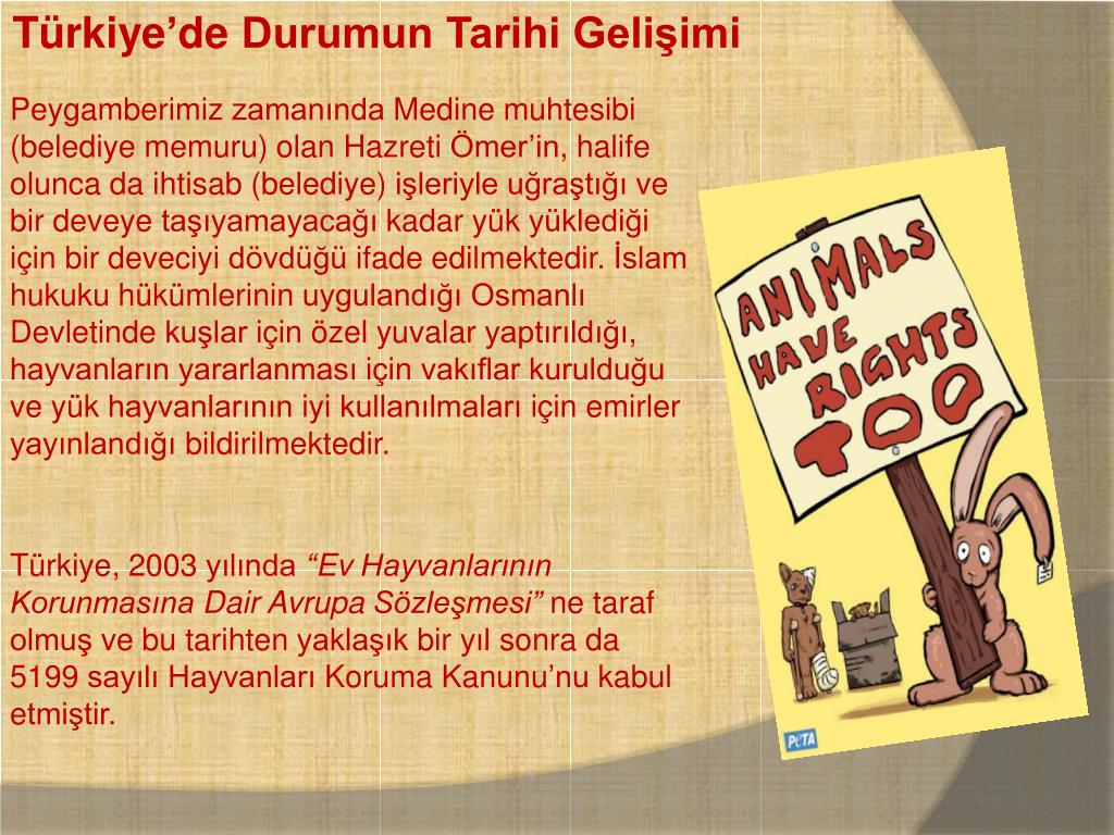 Türkiye’de Durumun Tarihi Gelişimi PeygamberimizzamanındaMedinemuhtesibi (belediyememuru)olanHazretiÖmer’in, halifeolunca da ihtisab (belediye)işleriyleuğraştığıvebirdeveyetaşıyamayacağıkadaryükyüklediğiiçinbirdeveciyidövdüğüifadeedilmektedir. İslam hukukuhükümlerininuygulandığıOsmanlıDevletindekuşlariçinözelyuvalaryaptırıldığı,hayvanlarınyararlanmasıiçinvakıflarkurulduğuveyükhayvanlarınıniyikullanılmalarıiçinemirleryayınlandığıbildirilmektedir. Türkiye, 2003 yılında“EvHayvanlarınınKorunmasınaDairAvrupaSözleşmesi” ne tarafolmuşvebutarihtenyaklaşıkbiryılsonra da 5199 sayılıHayvanlarıKorumaKanunu’nukabul etmiştir.