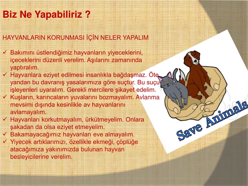 Biz Ne Yapabiliriz ? • HAYVANLARIN KORUNMASI İÇİN NELER YAPALIM • Bakımını üstlendiğimiz hayvanların yiyeceklerini, içeceklerini düzenli verelim. Aşılarını zamanında yaptıralım. • Hayvanlara eziyet edilmesi insanlıkla bağdaşmaz. Öte yandan bu davranış yasalarımıza göre suçtur. Bu suçu işleyenleri uyaralım. Gerekli mercilere şikayet edelim. • Kuşların, karıncaların yuvalarını bozmayalım. Avlanma mevsimi dışında kesinlikle av hayvanlarını avlamayalım. • Hayvanları korkutmayalım, ürkütmeyelim. Onlara şakadan da olsa eziyet etmeyelim. • Bakamayacağımız hayvanları eve almayalım. • Yiyecek artıklarımızı, özellikle ekmeği, çöplüğe atacağımıza yakınımızda bulunan hayvan besleyicilerine verelim.