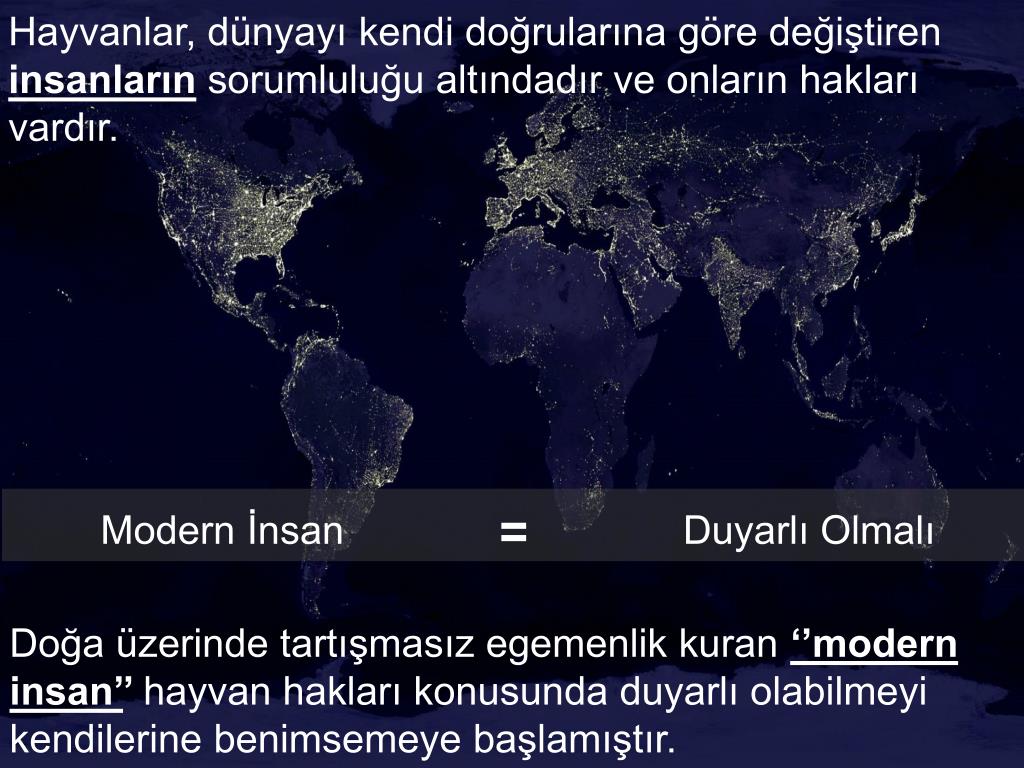 Hayvanlar, dünyayı kendi doğrularına göre değiştiren insanların sorumluluğu altındadır ve onların hakları vardır. Modern İnsan = Duyarlı Olmalı Doğa üzerinde tartışmasız egemenlik kuran ‘’modern insan’’ hayvan hakları konusunda duyarlı olabilmeyi kendilerine benimsemeye başlamıştır.