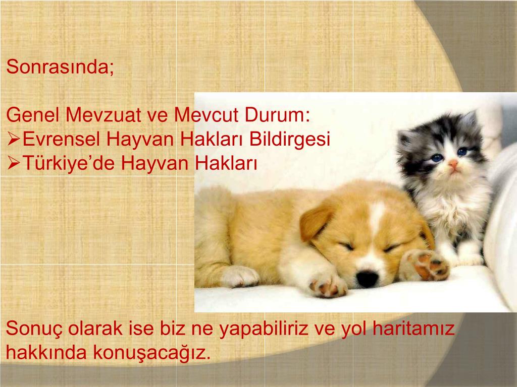 Sonrasında; • Genel Mevzuat ve Mevcut Durum: • Evrensel Hayvan Hakları Bildirgesi • Türkiye’de Hayvan Hakları Sonuç olarak ise biz ne yapabiliriz ve yol haritamız hakkında konuşacağız.