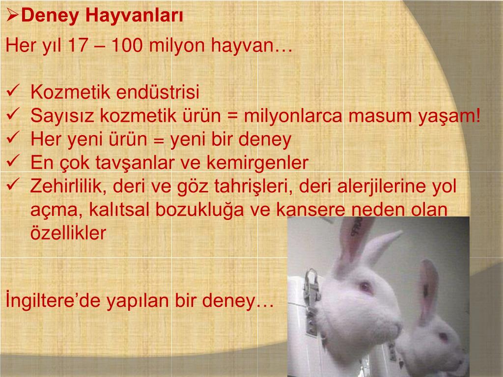 Deney Hayvanları • Her yıl 17 – 100 milyon hayvan… • Kozmetik endüstrisi • Sayısız kozmetik ürün = milyonlarca masum yaşam! • Her yeni ürün = yeni bir deney • En çok tavşanlar ve kemirgenler • Zehirlilik, deri ve göz tahrişleri, deri alerjilerine yol açma, kalıtsal bozukluğa ve kansere neden olan özellikler İngiltere’de yapılan bir deney…