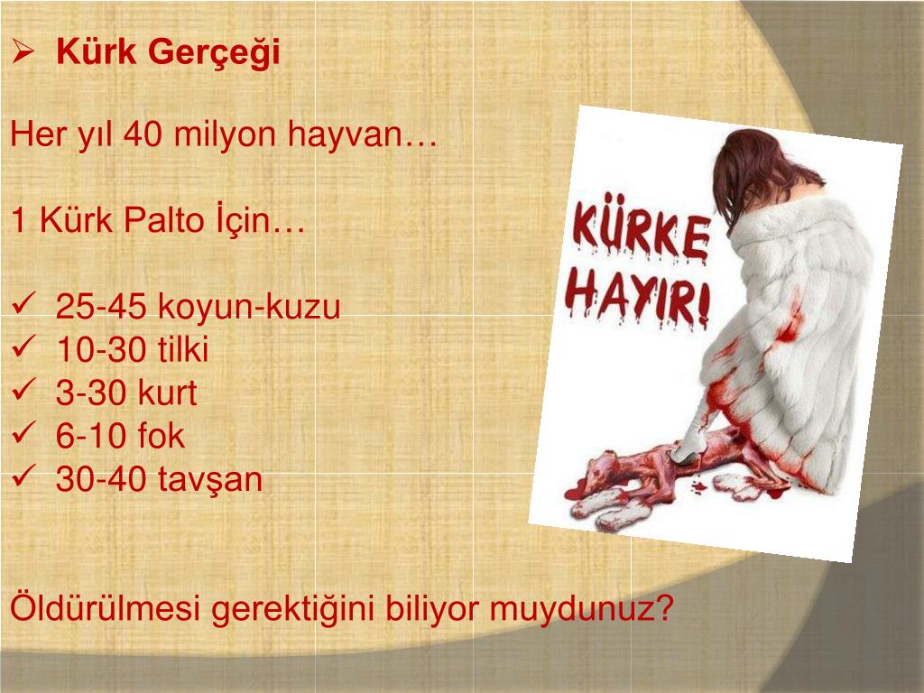 Kürk Gerçeği • Her yıl 40 milyon hayvan… • 1 Kürk Palto İçin… • 25-45 koyun-kuzu • 10-30 tilki • 3-30 kurt • 6-10 fok • 30-40 tavşan • Öldürülmesi gerektiğini biliyor muydunuz?