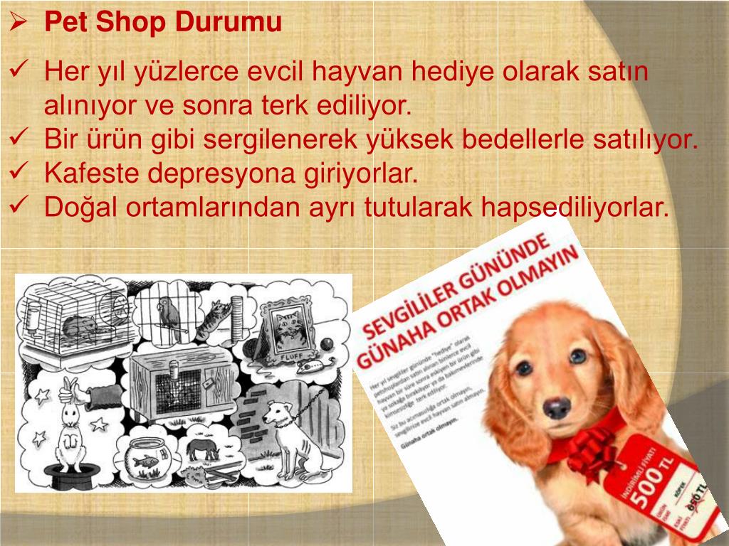 Pet Shop Durumu • Her yıl yüzlerce evcil hayvan hediye olarak satın alınıyor ve sonra terk ediliyor. • Bir ürün gibi sergilenerek yüksek bedellerle satılıyor. • Kafeste depresyona giriyorlar. • Doğal ortamlarından ayrı tutularak hapsediliyorlar.