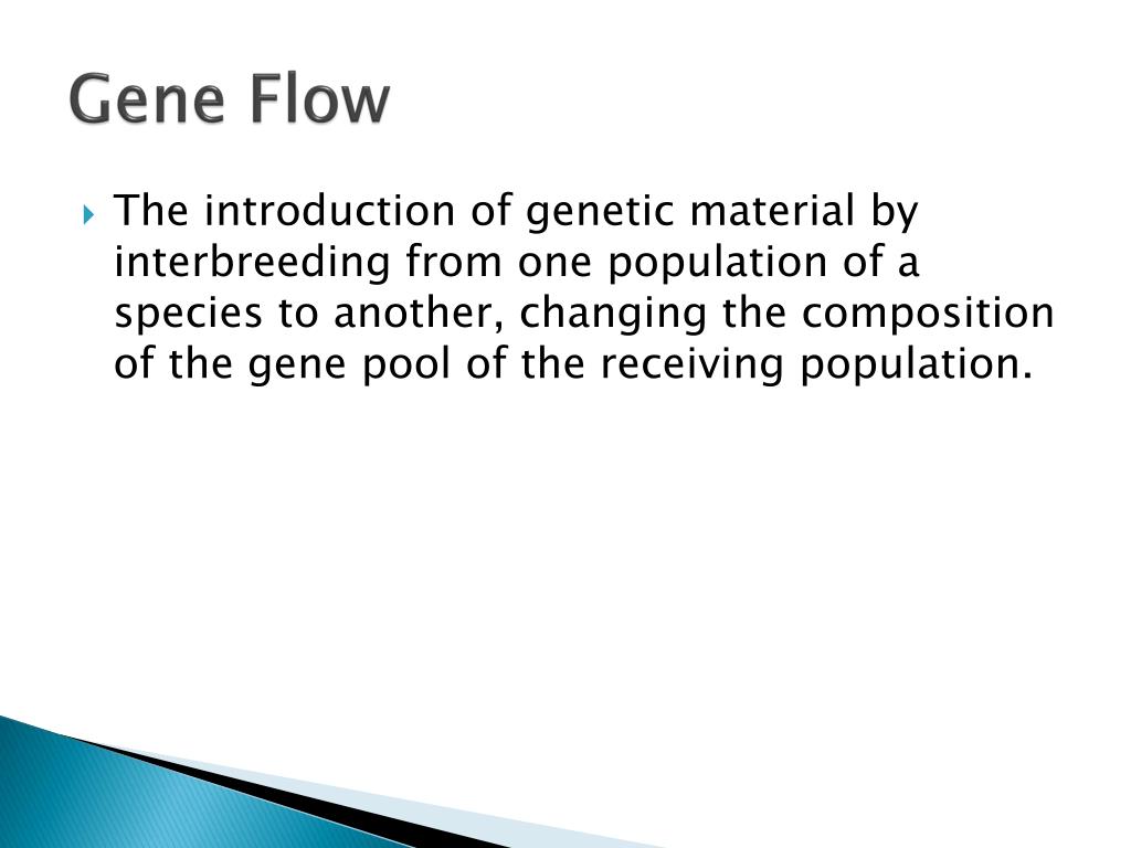 Gene Flow • The introduction of genetic material by interbreeding from one population of a species to another, changing the composition of the gene pool of the receiving population.