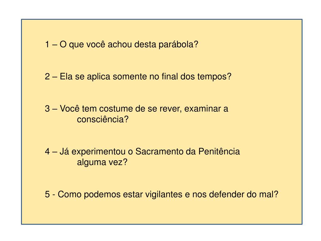 1 – O que você achou desta parábola? 2 – Ela se aplica somente no final dos tempos? 3 – Você tem costume de se rever, examinar a consciência? 4 – Já experimentou o Sacramento da Penitência alguma vez? 5 - Como podemos estar vigilantes e nos defender do mal?