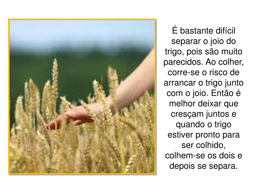 É bastante difícil separar o joio do trigo, pois são muito parecidos. Ao colher, corre-se o risco de arrancar o trigo junto com o joio. Então é melhor deixar que cresçam juntos e quando o trigo estiver pronto para ser colhido, colhem-se os dois e depois se separa.