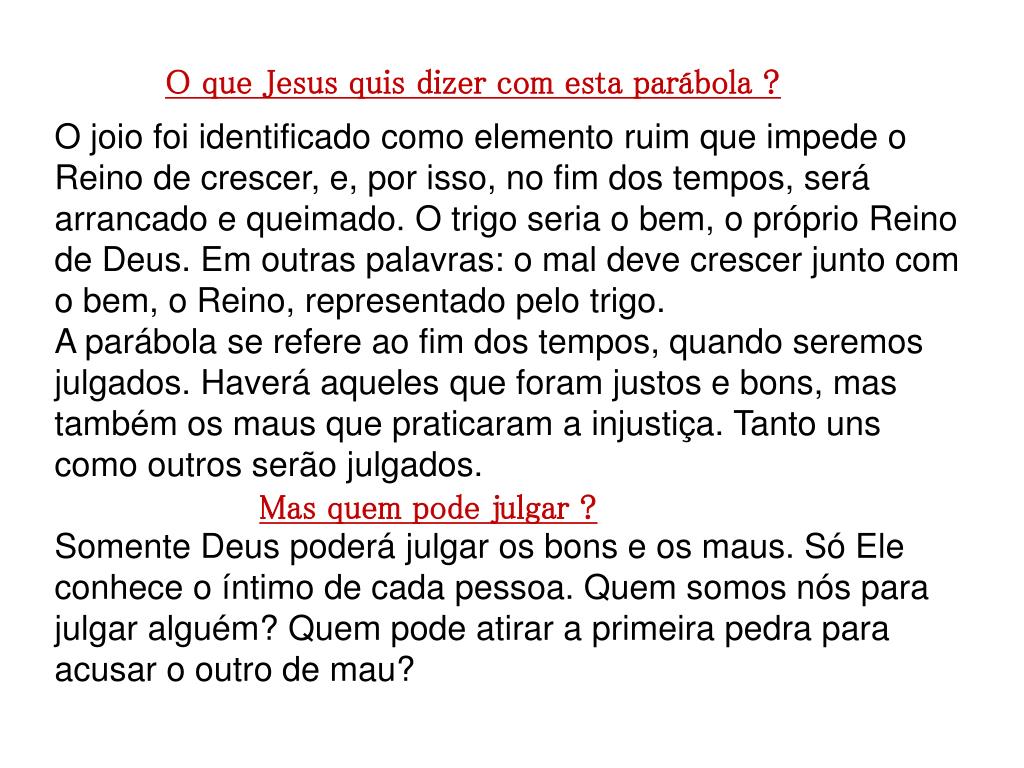 O que Jesus quis dizer com esta parábola ? O joio foi identificado como elemento ruim que impede o Reino de crescer, e, por isso, no fim dos tempos, será arrancado e queimado. O trigo seria o bem, o próprio Reino de Deus. Em outras palavras: o mal deve crescer junto com o bem, o Reino, representado pelo trigo. A parábola se refere ao fim dos tempos, quando seremos julgados. Haverá aqueles que foram justos e bons, mas também os maus que praticaram a injustiça. Tanto uns como outros serão julgados. Mas quem pode julgar ? Somente Deus poderá julgar os bons e os maus. Só Ele conhece o íntimo de cada pessoa. Quem somos nós para julgar alguém? Quem pode atirar a primeira pedra para acusar o outro de mau?