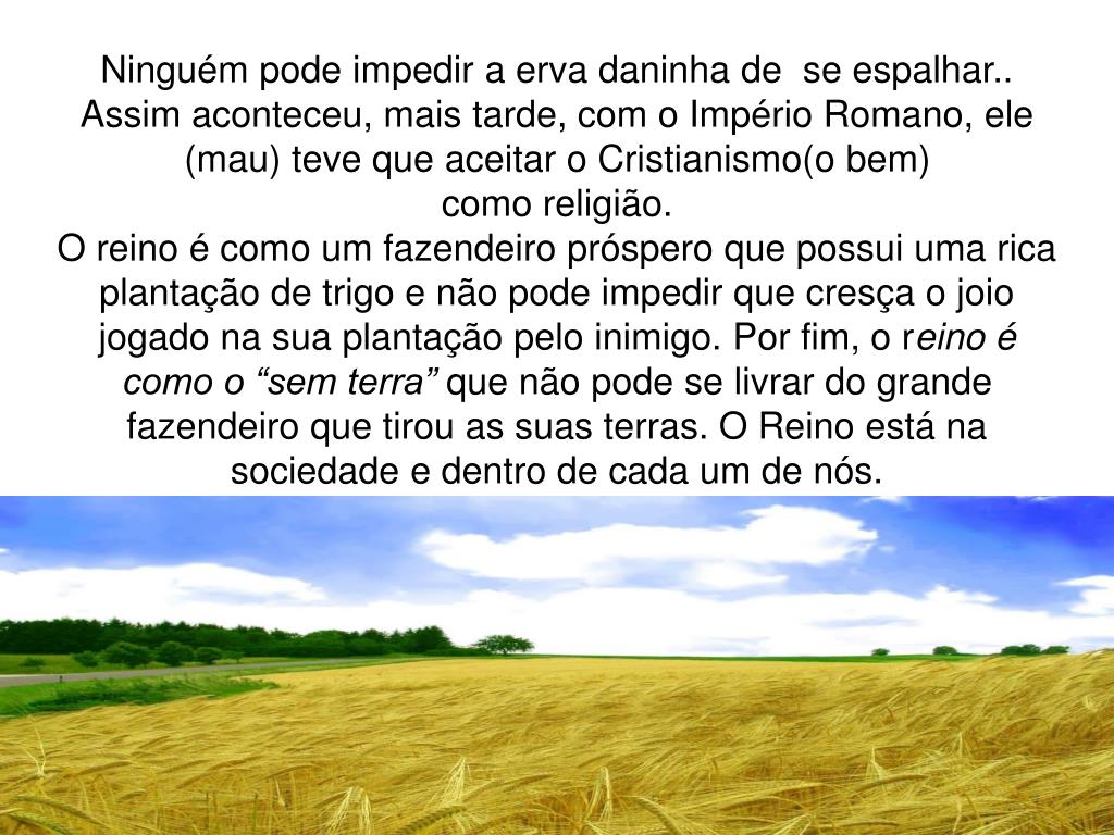 Ninguém pode impedir a erva daninha de se espalhar.. Assim aconteceu, mais tarde, com o Império Romano, ele (mau) teve que aceitar o Cristianismo(o bem) como religião. O reino é como um fazendeiro próspero que possui uma rica plantação de trigo e não pode impedir que cresça o joio jogado na sua plantação pelo inimigo. Por fim, o reino é como o “sem terra” que não pode se livrar do grande fazendeiro que tirou as suas terras. O Reino está na sociedade e dentro de cada um de nós.