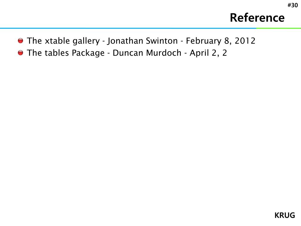 Reference • The xtablegallery - Jonathan Swinton - February 8, 2012 • The tables Package - Duncan Murdoch - April 2, 2