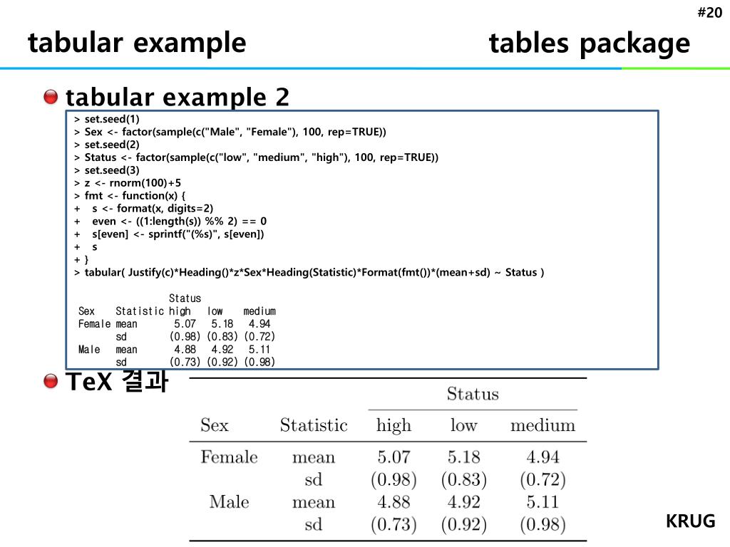 tabular example tables package • tabular example 2 • TeX결과 > set.seed(1) > Sex <- factor(sample(c("Male", "Female"), 100, rep=TRUE)) > set.seed(2) > Status <- factor(sample(c("low", "medium", "high"), 100, rep=TRUE)) > set.seed(3) > z <- rnorm(100)+5 > fmt <- function(x) { + s <- format(x, digits=2) + even <- ((1:length(s)) %% 2) == 0 + s[even] <- sprintf("(%s)", s[even]) + s + } > tabular( Justify(c)*Heading()*z*Sex*Heading(Statistic)*Format(fmt())*(mean+sd) ~ Status ) Status Sex Statistic high low medium Female mean 5.07 5.18 4.94 sd (0.98) (0.83) (0.72) Male mean 4.88 4.92 5.11 sd (0.73) (0.92) (0.98)