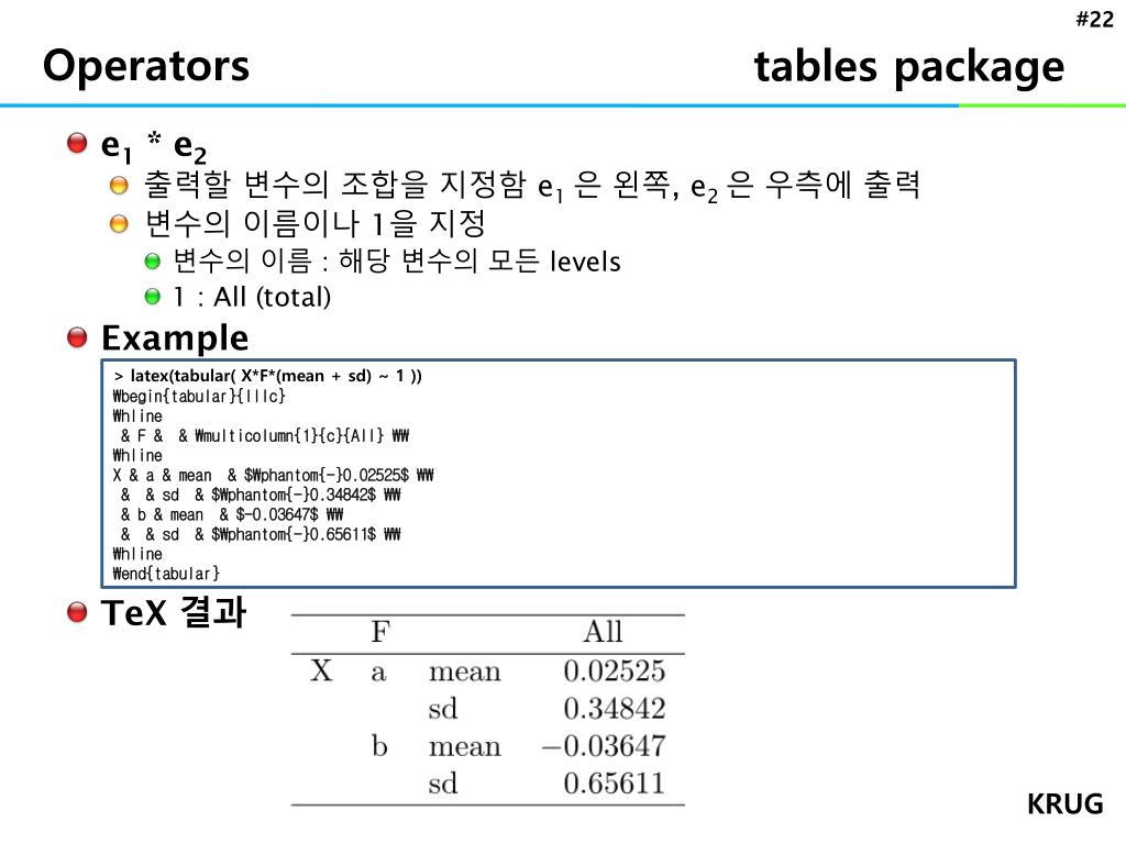Operators tables package • e1 ~ e2 • 집계 기준을 지정함 e1 은 변수 칼럼, e2 은 집계 칼럼 • 변수의 이름이나 1을 지정 • 변수의 이름 : 해당 변수의 levels • 1 : All (total) • Example • TeX결과 > latex(tabular(X*F ~ mean + sd)) \begin{tabular}{llcc} \hline & F & mean & \multicolumn{1}{c}{sd} \\ \hline X & a & $\phantom{-}0.02525$ & $0.3484$ \\ & b & $-0.03647$ & $0.6561$ \\ \hline \end{tabular}