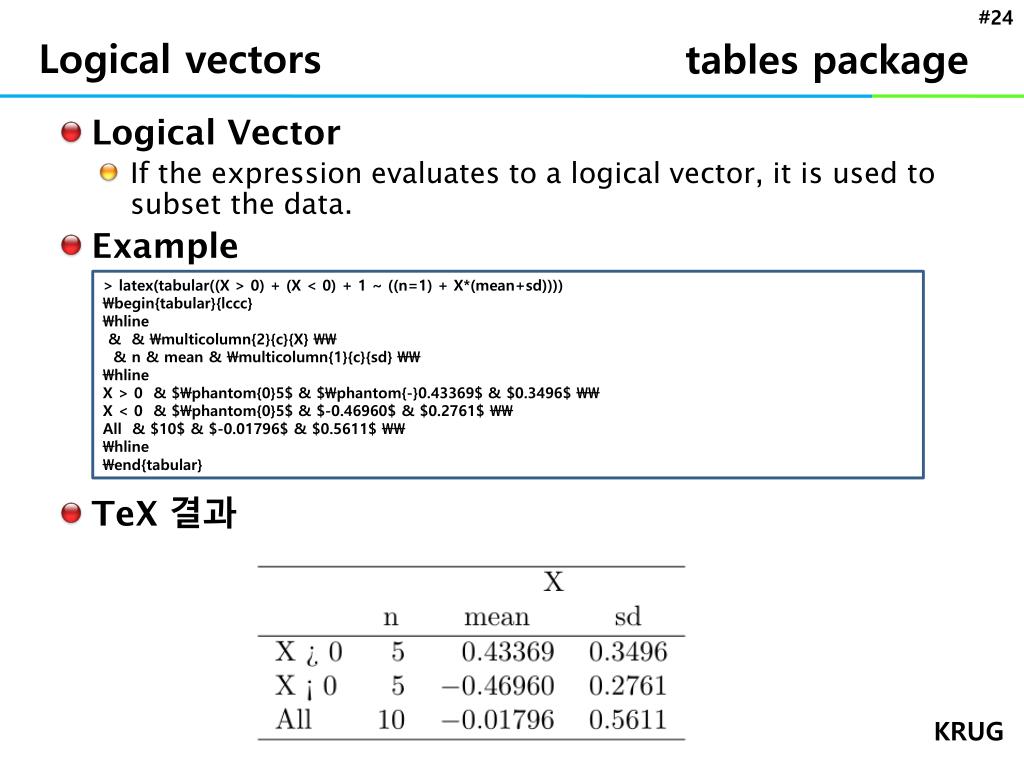 Logical vectors tables package • Logical Vector • If the expression evaluates to a logical vector, it is used to subset the data. • Example • TeX결과 > latex(tabular((X > 0) + (X < 0) + 1 ~ ((n=1) + X*(mean+sd)))) \begin{tabular}{lccc} \hline & & \multicolumn{2}{c}{X} \\ & n & mean & \multicolumn{1}{c}{sd} \\ \hline X > 0 & $\phantom{0}5$ & $\phantom{-}0.43369$ & $0.3496$ \\ X < 0 & $\phantom{0}5$ & $-0.46960$ & $0.2761$ \\ All & $10$ & $-0.01796$ & $0.5611$ \\ \hline \end{tabular}