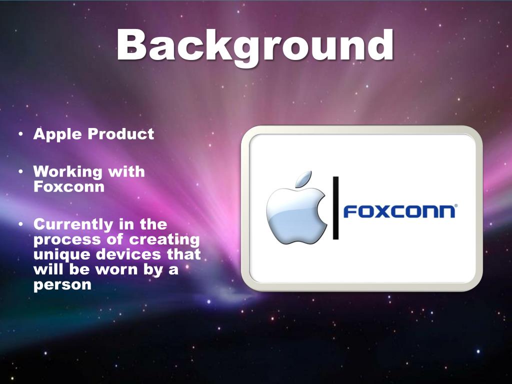 Apple Product • Working with Foxconn • Currently in the process of creating unique devices that will be worn by a person Background