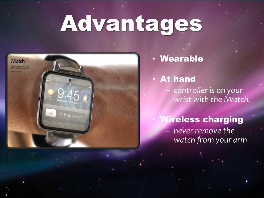Wearable • At hand • controller is on your wrist with the iWatch. • Wireless charging • never remove the watch from your arm Advantages