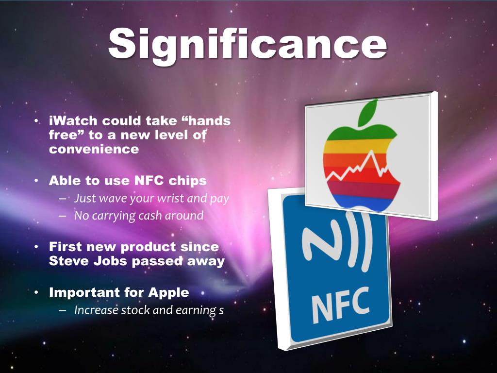Significance • iWatch could take “hands free” to a new level of convenience • Able to use NFC chips • Just wave your wrist and pay • No carrying cash around • First new product since Steve Jobs passed away • Important for Apple • Increase stock and earning s