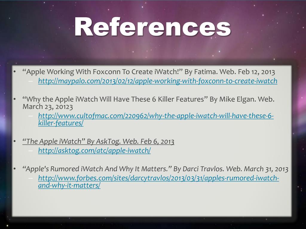 “Apple Working With Foxconn To Create iWatch!” By Fatima. Web. Feb 12, 2013 • http://maypalo.com/2013/02/12/apple-working-with-foxconn-to-create-iwatch • “Why the Apple iWatch Will Have These 6 Killer Features” By Mike Elgan. Web. March 23, 20123 • http://www.cultofmac.com/220962/why-the-apple-iwatch-will-have-these-6-killer-features/ • “The Apple iWatch” By AskTog. Web. Feb 6, 2013 • http://asktog.com/atc/apple-iwatch/ • “Apple's Rumored iWatch And Why It Matters.” By DarciTravlos. Web. March 31, 2013 • http://www.forbes.com/sites/darcytravlos/2013/03/31/apples-rumored-iwatch-and-why-it-matters/ References