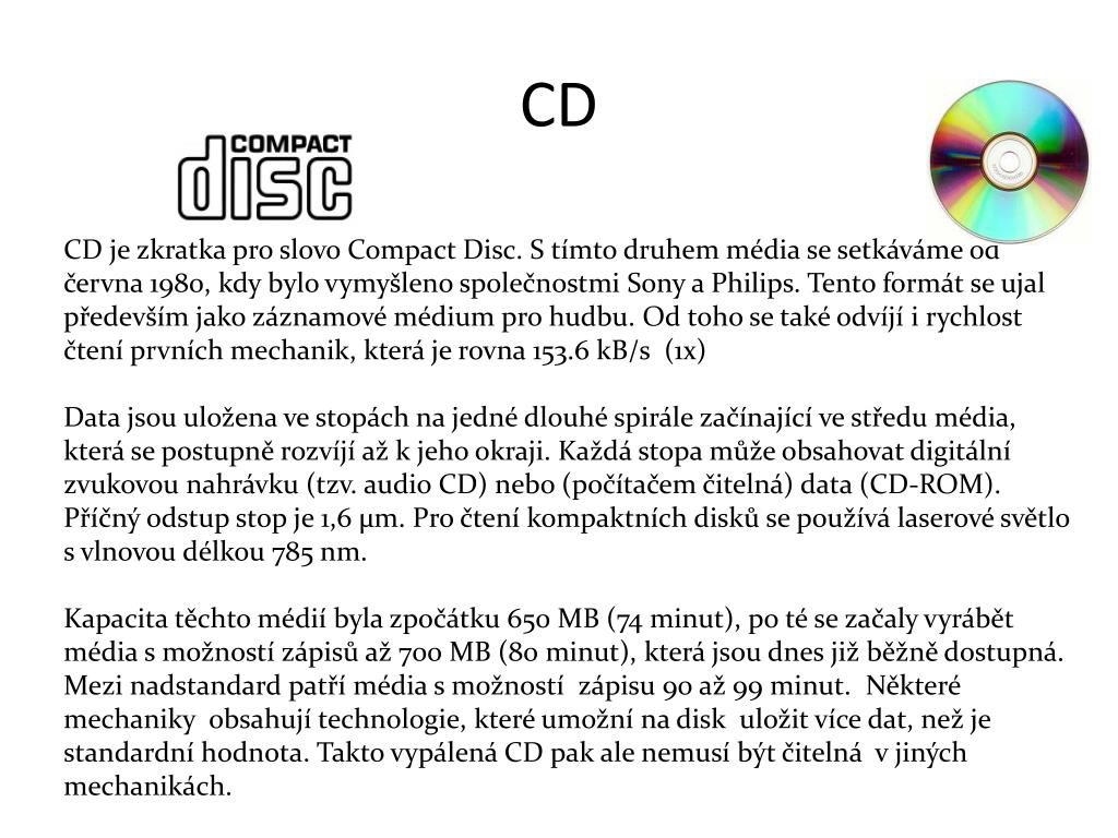 CD CD je zkratka pro slovo Compact Disc. S tímto druhem média se setkáváme od června 1980, kdy bylo vymyšleno společnostmi Sony a Philips. Tento formát se ujal především jako záznamové médium pro hudbu. Od toho se také odvíjí i rychlost čtení prvních mechanik, která je rovna 153.6 kB/s (1x) Data jsou uložena ve stopách na jedné dlouhé spirále začínající ve středu média, která se postupně rozvíjí až k jeho okraji. Každá stopa může obsahovat digitální zvukovou nahrávku (tzv. audio CD) nebo (počítačem čitelná) data (CD-ROM). Příčný odstup stop je 1,6 μm. Pro čtení kompaktních disků se používá laserové světlo s vlnovou délkou 785 nm. Kapacita těchto médií byla zpočátku 650 MB (74 minut), po té se začaly vyrábět média s možností zápisů až 700 MB (80 minut), která jsou dnes již běžně dostupná. Mezi nadstandard patří média s možností zápisu 90 až 99 minut. Některé mechaniky obsahují technologie, které umožní na disk uložit více dat, než je standardní hodnota. Takto vypálená CD pak ale nemusí být čitelná v jiných mechanikách.