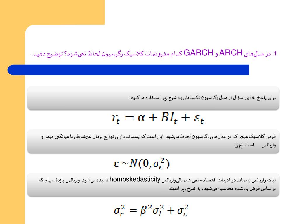 1. در مدلهای ARCH و GARCH کدام مفروضات کلاسیک رگرسیون لحاظ نمیشود؟ توضیح دهید.