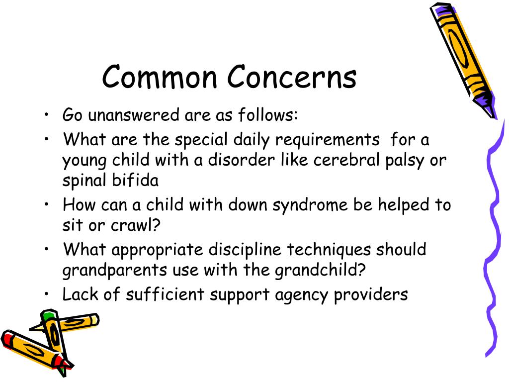 Common Concerns • Go unanswered are as follows: • What are the special daily requirements for a young child with a disorder like cerebral palsy or spinal bifida • How can a child with down syndrome be helped to sit or crawl? • What appropriate discipline techniques should grandparents use with the grandchild? • Lack of sufficient support agency providers