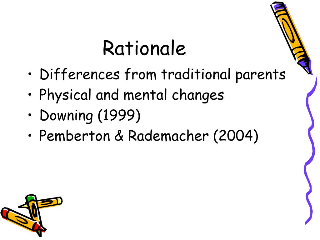 Rationale • Differences from traditional parents • Physical and mental changes • Downing (1999) • Pemberton & Rademacher (2004)