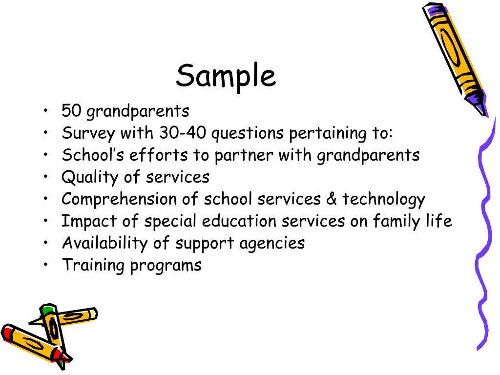 Sample • 50 grandparents • Survey with 30-40 questions pertaining to: • School’s efforts to partner with grandparents • Quality of services • Comprehension of school services & technology • Impact of special education services on family life • Availability of support agencies • Training programs