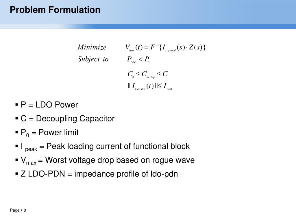 Problem Formulation • P = LDO Power • C = Decoupling Capacitor • P0 = Power limit • I peak = Peak loading current of functional block • Vmax = Worst voltage drop based on rogue wave • Z LDO-PDN = impedance profile of ldo-pdn
