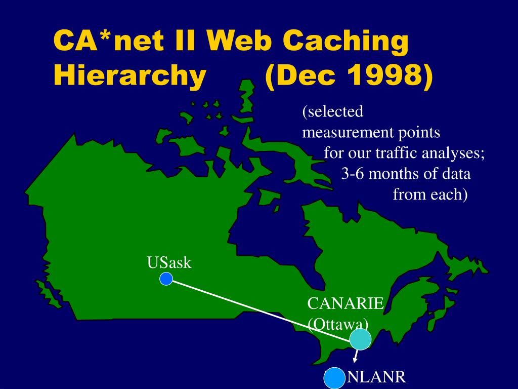 CA*net II Web Caching Hierarchy (Dec 1998) (selected measurement points for our traffic analyses; 3-6 months of data from each) USask CANARIE (Ottawa) To NLANR