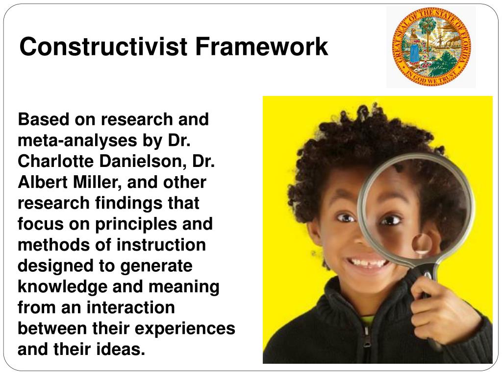 Constructivist Framework Based on research and meta-analyses by Dr. Charlotte Danielson, Dr. Albert Miller, and other research findings that focus on principles and methods of instruction designed to generate knowledge and meaning from an interaction between their experiences and their ideas.