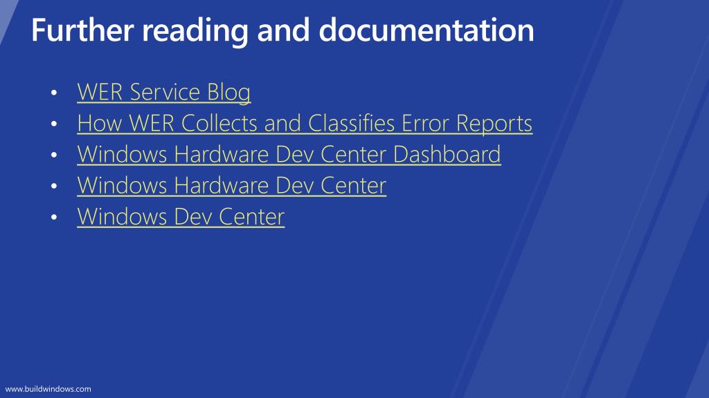 Further reading and documentation • WER Service Blog • How WER Collects and Classifies Error Reports • Windows Hardware Dev Center Dashboard • Windows Hardware Dev Center • Windows Dev Center